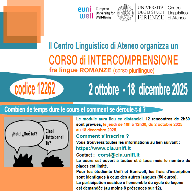 Il CLA organizza corsi di Intercomprensione dall'a.a. 2020/2021 che hanno ispirato il progetto Well-beIntercomprehension nato nell'ambito del consorzio EUniwell, la rete di Atenei europei con la missione di migliorare il benessere dei cittadini attraverso le attività di ricerca e formazione e l'impegno istituzionale.